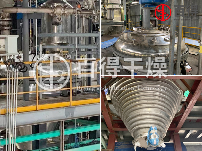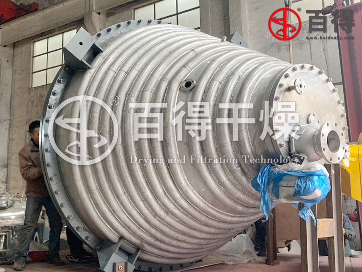 为解决上述的技术问题,常州百得研制的大型重载式真空单锥干燥机(发明专 利号:202111275944.6),通过在下锥体内设置了双内加热螺带搅拌器,尤其是设置了变螺距螺带,从而运转时螺带带面上的各点线速度不同,物料在其作用下产生了不规则的对流、剪切、掺混、扩散,形成全方位的三维运动,而且内加热螺带还设置了新型内倾斜式结构,可有效解决物料粘结设备筒体内壁问题,适用性强,粘度大、热穿透性差,易滚球、易抱团成块的物料能得到高效的强制传热性能。