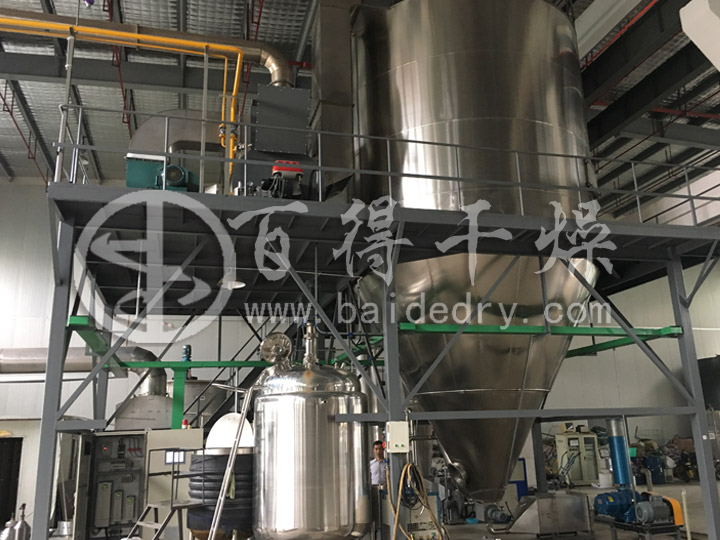 一个圆柱形高大的筒体,底部为锥形体,用于喷雾干燥。该塔体有热风的进出口、检查清洗口、观察孔、照明孔等。锥形部分还装有敲打装置。整个塔体安装在一个钢架支架上。