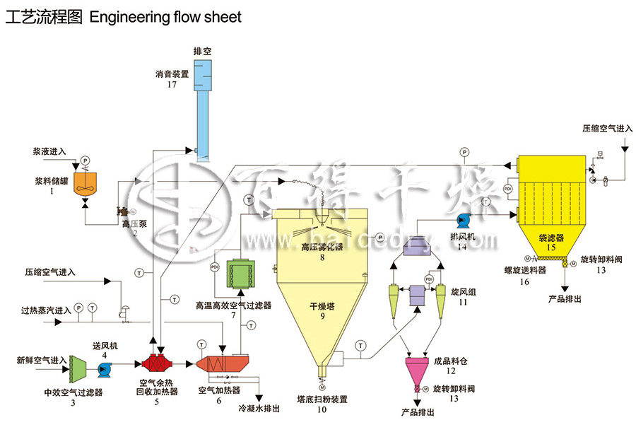 ⑤ 设计了合理的主塔直筒体的高径比,以保证物料足够的停留时间,保证喷雾干燥效果。