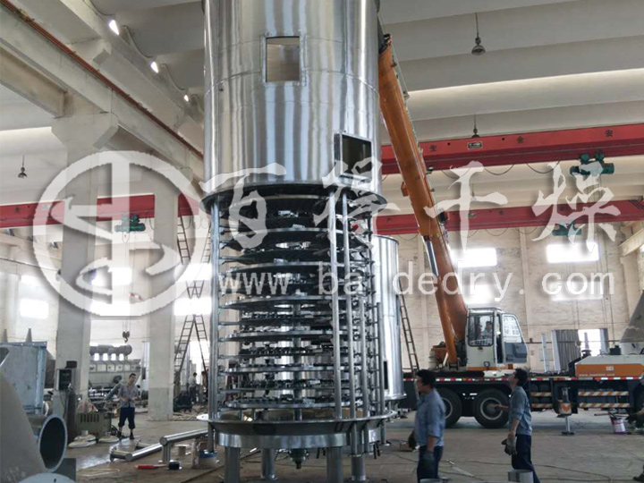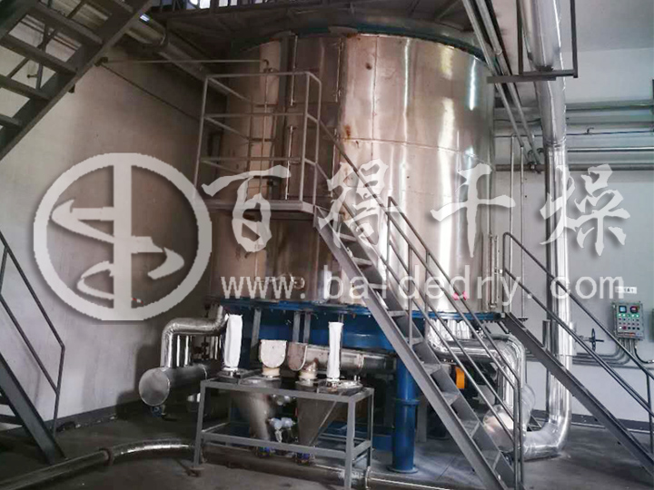 3、立式安装,保温完善,热源和废热利用率高。 蒸发每公斤水仅需1.1~1.4 kg蒸气。此外所需动力仅为回转圆筒干燥机的1/10左右,经济可行;