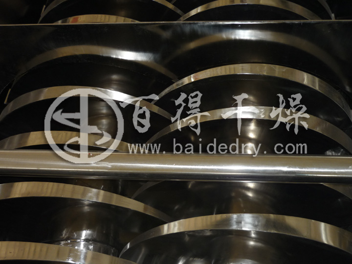有些湿物料粘度高,流动性差,为了使这类物料向前流动,普通桨叶干燥机安装时设备整体向出料口方向成一定倾角,但是当设备倾斜放置时 不能很好控制物料的流动速度,这样很难控制物料干燥水份,为了提高湿物料在桨叶干燥机内部流动性,对桨叶的外部结构作了一定的改动,使桨叶对物料有向前推进作用。改变桨叶轴转速就可控制物料的推进速度,使物料有一个合理的推进速度,保持物料在设备内部有一个合理的料位,使物料与桨叶表面充分接触,进一步提高传热面积。