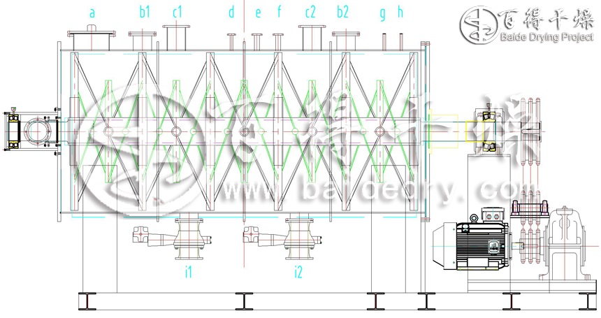 现有真空耙式干燥机的搅拌轴一般都采用耙臂带耙叶结构,对阻燃剂等流动状态差的细颗粒干燥存在一定弊端,主轴和耙齿均没有内部加热结构,有的尽管采用了空心轴和空心耙齿,但由于流体流道结构设计不合理,干燥效率较低,直接制约了设备的规模化、大型化,其次采用简单的填料密封结构会严重影响产品质量,针对这些问题,通过实验研究,百得干燥对螺带式耙杆、折流型夹套、特殊流道型热轴和新型密封结构等进行改良创新,其技术达到了^。