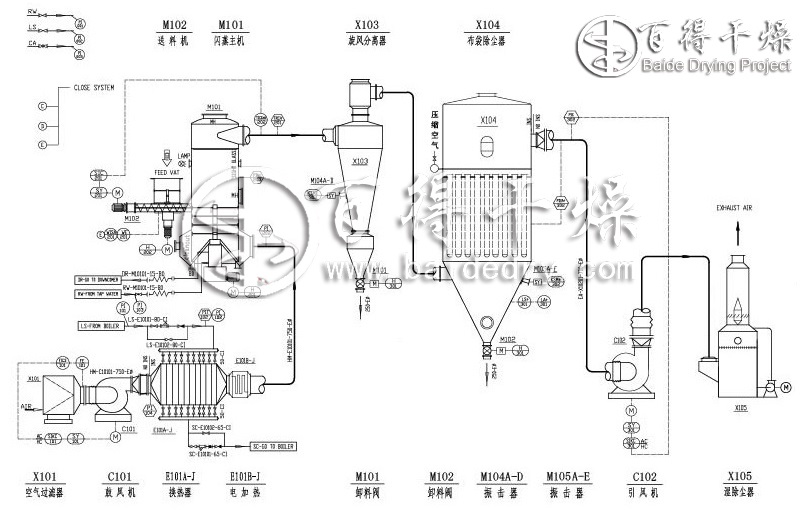 针对以上问题,百得干燥借鉴各类传统干燥机械长期在各自领域中的实际使用效果和经验理论总结,根据各个技术参数对产品产能的影响,围绕旋转闪蒸干燥机的结构进行了大量的重新计算和设计,主要包括对鼓风机、引风机、换热器、旋风分离器、脉冲式捕集器及风筒等部件进行了大量的机械优化改造实验。主要的对策与采取的措施如下: