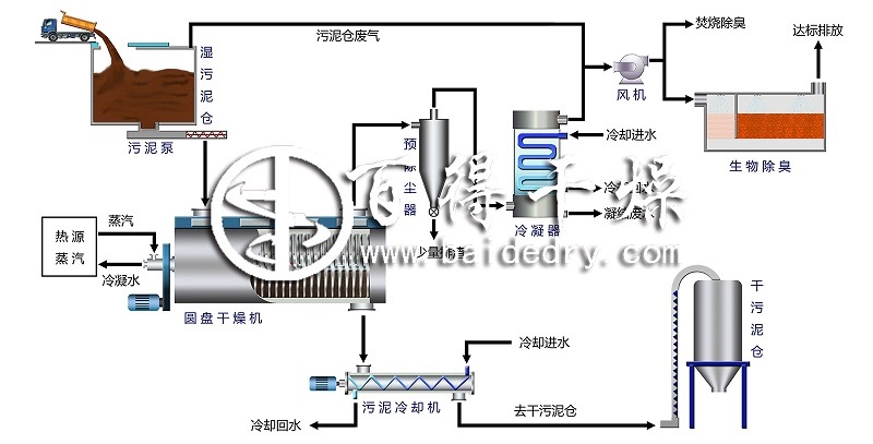 针对以上问题,百得干燥通过借鉴市政污泥干化处理技术,并且针对废药渣污泥与市政污泥特性不同,完善了新型卧式圆盘干燥机,并进行了系统的设计,较好解决了废药渣污泥预处理的输送、干化和尾气处理环节存在的技术难点,通过客户的实际生产证明,该干燥系统可完全满足环保要求。