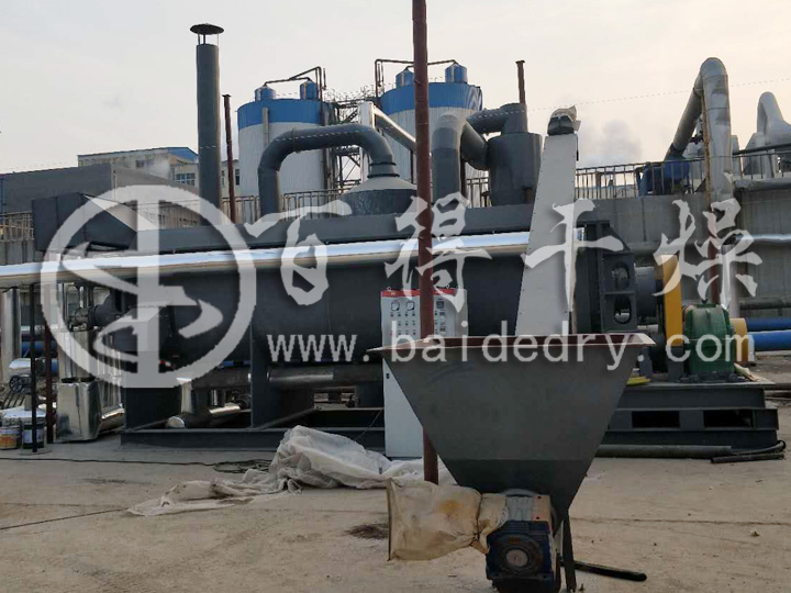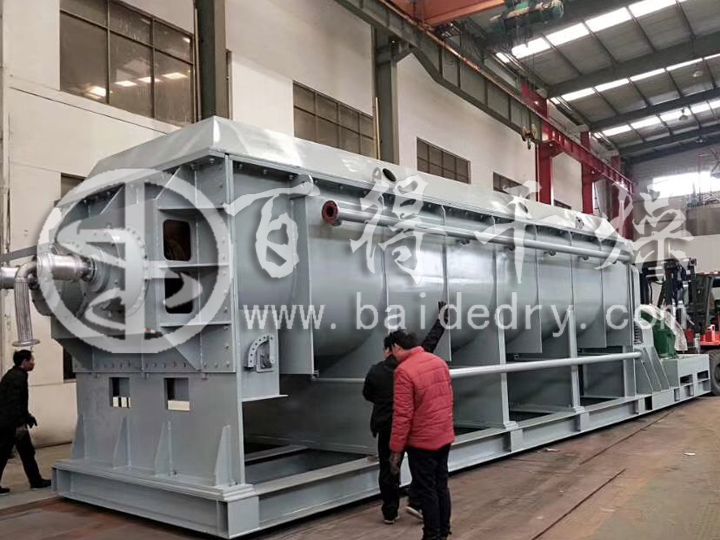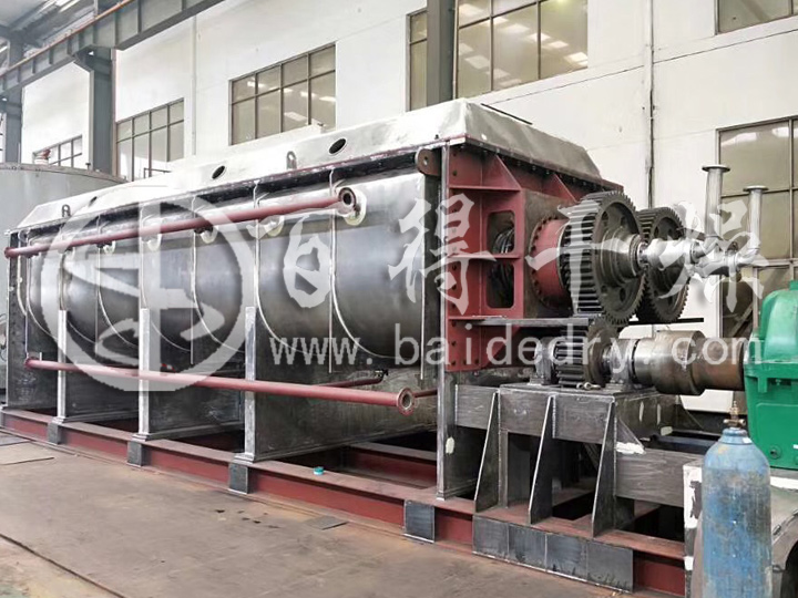 正常情况下,加热介质从两路分别进入到壳体夹套和桨叶轴内腔中,同时对器身和桨叶轴进行加热,通过传导热的形式将物料干燥。物料经过干燥之后通过螺旋送料机以连续的方式定量的送到干燥机的加料口,进入到干燥机的机身之后由桨叶带动进行旋转、搅拌,不断的使加热介面和器身以及桨叶进行接触,使物料得到充分的加热,以便使物料水分充分蒸发。同时,随着桨叶轴的旋转,物料被螺旋形的送到出料口方向,在输送的过程中由于还始终处于搅拌状态,污泥中的水分还在不断的蒸发。直到^后,干燥合格的物料从出料口排出。