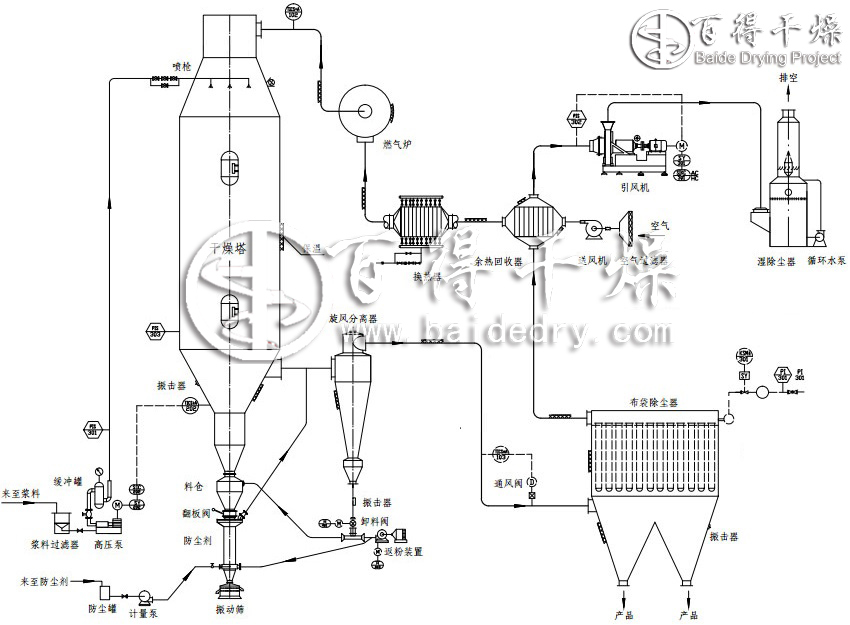 喷雾干燥的过程是一个高能耗的运行过程。在喷雾造粒干燥技术中,热效率是一个突出的问题。一般来讲,因为进入干燥器(喷塔)内部的空气温度为180℃,排出的尾气温度为90℃,而它们用于蒸发水分的热量为总热量的39%,尾气损失为34%,喷塔壁损失的热量为7.5%,加热器的热损失为18%,可见大部分热能损失掉了。百得干燥经过多年的研究、开发、生产实践过程中取得了丰富的经验。对喷塔和其相关设备的合理设计和选用介绍如下。