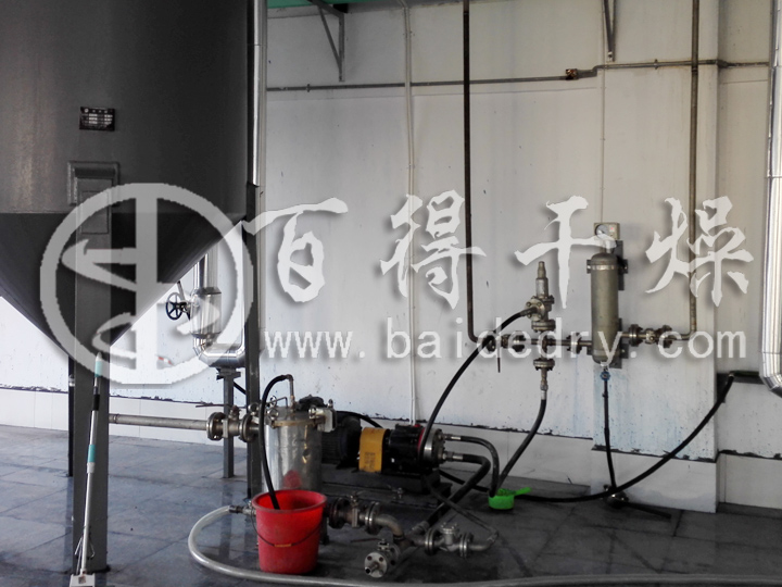 农药水悬浮液通过过滤器,由隔膜泵,提升经稳压后送至干燥塔顶由喷嘴雾化后喷入干燥塔中进行干燥,同时冷空气经蒸汽加热器,电加热器,加热后进入塔内与物料并流由上向下进行质、热交换,其温度接近于纯粹的^温度,而其物料在高温区具有很大的表面。即物料在瞬时完成干燥,从而得到空心球状的粒状产品。尾气经旋风分离器由引风机导向湿式捕集器。尾气中夹带的细粉由旋风分离器捕集回收。剩余的微少细粉由湿式除尘器捕集回收。整个系统是在负压、密闭状态下运行。