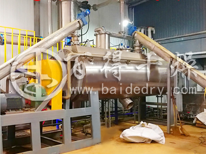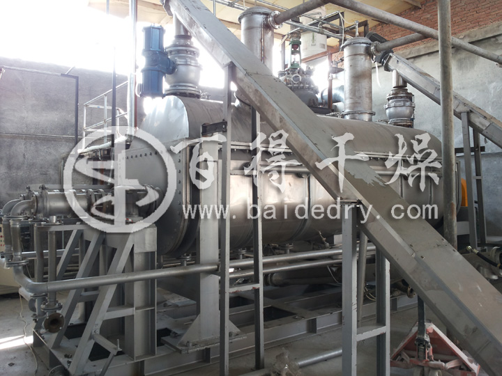 真空耙式干燥机为原型,将耙叶改为桨叶,桨叶为空心结构,参与干燥传热,传热效率很高。因为干燥机的桨叶呈现空心结构,故又可称为空心桨叶干燥机。需被干燥的物料由绞龙连续定量地送至进料口,物料进入机身后,填充于筒体与主轴及桨叶之间,桨叶随着主轴转动,使物料随之提升、搅拌、翻转,不断更新加热介面,与机身和桨叶接触后被充分加热,水分受热升温蒸发,产生的水蒸气,由与排气口连接的抽风机抽出,经过旋风除尘器回收水蒸汽中混有的少量粉状物料。