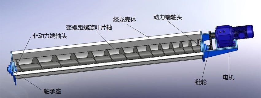 鱼粉生产在各个工序之间的传输都由输送绞龙进行实现。一般的输送绞龙密封性较差,不适用于真空干燥前后的输送任务。为此,对输送绞龙的部分结构进行了改进,使其能满足真空干燥机进出料的要求。变螺距螺旋叶片是其^主要的特点。鱼粉从非动力端传送至动力端。在电机转速一定时,各叶片之间螺距不同从而导致在叶片转速相同情况下导程不同。非动力端的叶片螺距大,越靠近动力端,螺距越小,因此鱼粉进入绞龙非动力端向着动力端移动时相同时间内运动的路程逐渐减少。因此鱼粉逐渐在动力端堆积,随着时间的推移,堆积而成的鱼粉被挤压得紧实,致使鱼粉内含有的空气被挤压逸出,外界的空气也很难进入,实现密封的状态。密封绞龙实现了进出料的初步密封,对于实现低温真空干燥有非常重要的作用。但其也存在着一些缺陷:鱼粉加工的原料有一些是水产品加工时产生的下脚料,通常由于管理、运输等各种不当因素,导致原料中混有各种垃圾(金属、石子、绳索等),这些垃圾在前几道工序中虽有处理,但仍会有不少遗留,他们的存在通常导致密封绞龙卡死,无法正常工作。因此密封绞龙适用于原料含杂质较少,或者在此之前杂质被处理的情况。