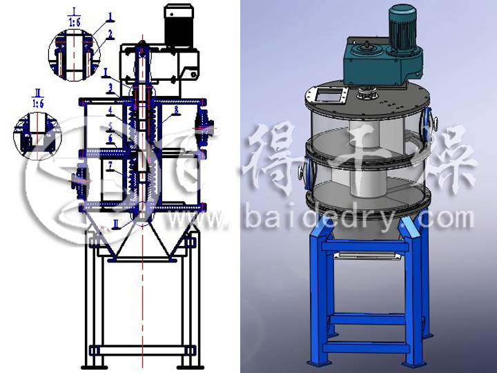 百得干燥开发设计的鱼粉专用低温烘干机,采用真空干燥技术,使干燥机筒体内部的压力保持在0.06MPa,从而使鱼粉在80℃左右进行干燥,实现低温干燥,降低了蛋白质的氧化程度,提高鱼粉质量。根据鱼粉生产的情况及工作环境的特点,改进真空干燥的工艺流程,主要包括粉碎、进料、加热干燥、出料等步骤,另外对废蒸汽的回收利用进行了优化。废蒸汽被抽真空泵抽吸经引风管道进入浓缩冷凝器,与浓缩器内的鱼蛋白水及冷凝器的冷凝水进行热交换,充分利用废蒸汽的热量,浓缩鱼蛋白液,同时废蒸汽冷凝,减小了废气处理量,节约能源,保护环境。