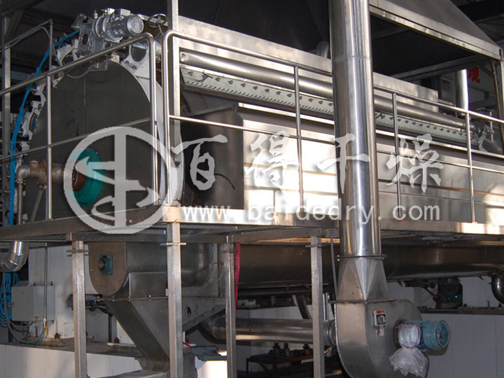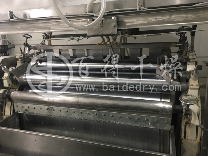 滚筒刮板干燥机是一种内加热传导型转动连续干燥设备。其基本操作原理是将料浆均匀地分布于以蒸汽加热的滚筒表面,形成一层薄膜水分随即迅速被蒸发掉。然后利用刮刀将薄膜刮下,产品为片状,再进行破碎,以取得颗粒状的干燥产品。滚筒干燥机适用于化工、染料、制药、食品、冶金等行业液体物料或粘稠物料的干燥。由于其具有快速干燥液状、胶状或膏糊状原料的特性,因此正越来越多的用于变性淀粉的生产。