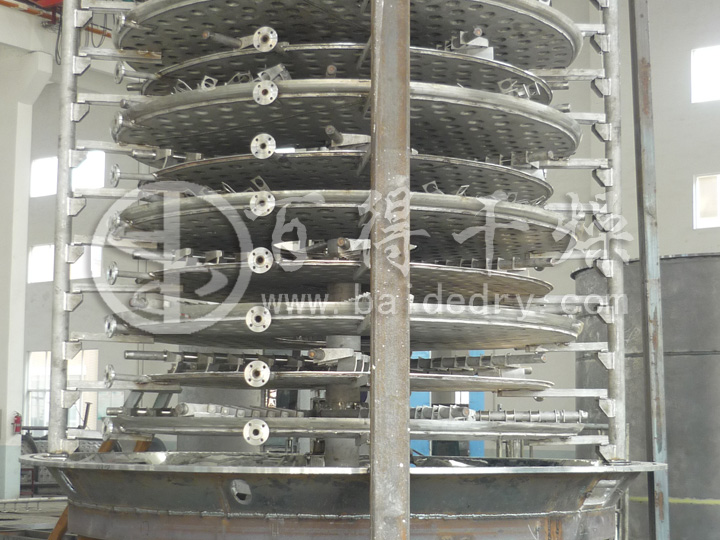 盘式干燥机是在间歇搅拌传导干燥器的基础上,综合了一系列先进技术,经过不断改进而研制开发的一种多层固定空心加热圆形载料盘、转耙搅拌、立式连续的以热传导为主的干燥设备。这种干燥过程,就是将载热体通入各层空心圆盘内,以热传导的方式间接加热盘面上所放置的湿物料,在转动耙叶的刮耙作用下,使不断移动翻滚的物料内的湿份在操作温度下蒸发,其蒸汽随设备尾气排出,从而在设备底部连续地获取合格的干燥成品。