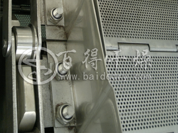(7) 氨基模塑料专用网带式干燥机输送系统两侧设有导向装置,用于纠正输送带运行时左右偏差,保证输送系统的正常输送。