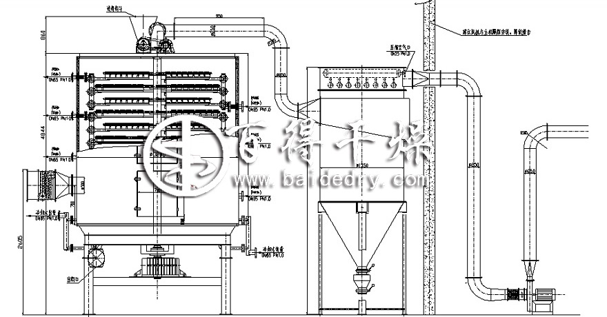由于在干燥过程中,物料上进下出,物料分布也是上湿下干,且干燥尾气流速极低(约0.1m/s),因此物料粉尘很难浮到设备顶部,更不会被尾气夹带排走,不仅不损失物料,而且不会污染环境。