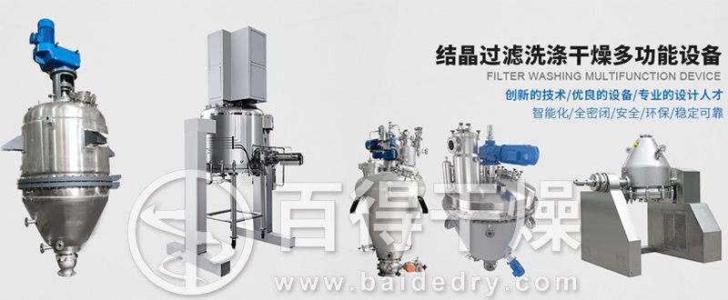原料药生产过程中,常见的生产工艺过程为:反应→结晶→过滤→洗涤→过滤→干燥。老工艺生产设备中每个单元操作都有相应的单元设备,设备分散性大,且很多时候需要手工操作,劳动强度大,物料在转移过程中,暴露时间长,人为污染严重。针对这些问题,常州百得干燥在引进、消化外国先进技术的基础上,研制出筒锥式反应过滤干燥三合一多功能设备。