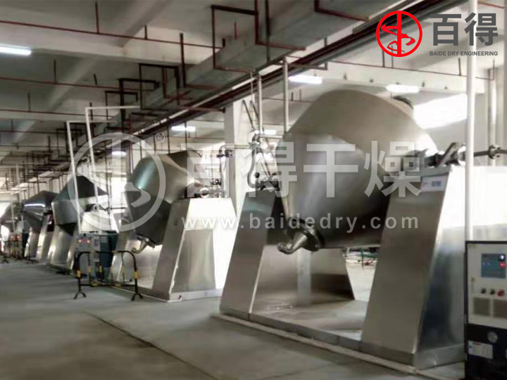 双锥回转真空干燥机为双锥形的回转罐体,罐内在真空状态下,向夹套内通入蒸汽或热水进行加热,热量通过罐体内壁与湿物料接触,湿物料吸热后蒸发的水汽,通过真空泵经真空排气管被抽走。由于罐体内处于真空状态,且罐体的回转使物料不断的上下内外翻动,故加快了物料的干燥速度,提高干燥效率,达到均匀干燥的目的。双锥回转真空干燥机系统主要由双锥回转真空干燥机、冷凝器、除尘器、真空抽气系统、加热系统、冷却系统、电控系统等组成。