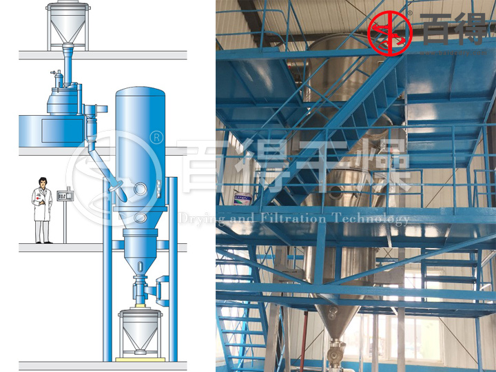 闭路循环沸腾干燥机在使用前,使用氮气将系统内的空气置换出,使系统内的氧气含量达到溶媒的安全浓度之内。湿物料在密闭容器内,由设备上的进料口进入干燥主机内。送风机送入经过滤后的氮气,经加热器加热至干燥工艺所需的温度,进入沸腾床对由位差加料口加入的物料进行传热传质(干燥),加料完成后干燥至物料所需终湿度。在干燥过程中,湿热气体带着少数的微粉经除尘器将所有2um以上的微粉在除尘器内进行气固分离。固体粉尘在除尘器内收集,气体进入多级冷凝器(翅片式冷凝器压降小,冷凝效果好),将湿热气体内的溶媒冷凝。冷凝后的溶媒经收集罐收集后进行储存(零排放至空气中,可循环使用)。经冷凝除湿后的干燥氮气再经送风机送入加热器循环使用。干燥完成后的物料由翻板机构将热风分布板上的物料放入下筒体,经真空泵或气流输送系统输入至密闭容器内储存分装(进出料皆在密闭环境内操作,车间无粉尘)。