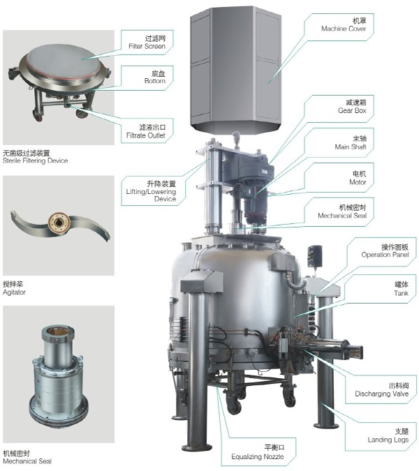 过滤洗涤干燥三合一由罐体、搅拌装置、轴端密封装置、升降机构、液压升降装置、可拆式罐底座、加热装置、传动机构、出料阀、取样阀、洗涤(清洗)灭菌装置、搅拌升降行程指示装置、显示屏与手动操作控制装置、液压泵站、主电控柜等部件组成,实现机、电、仪表一体化。