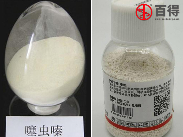 噻虫嗪属于高效低毒杀虫剂,是取代那些对哺乳动物毒性高、有残留和环境问题的有机磷、氨基甲酸酯、有机氯类杀虫剂的较好品种,其主要生产工艺包括:合成、萃取、结晶、离心干燥、重结晶等工艺。结晶过滤得到滤液和滤饼,滤饼用甲醇淋洗两次,真空烘干,即得到噻虫嗪原药。杀虫剂噻虫嗪干燥时需考虑以下问题: