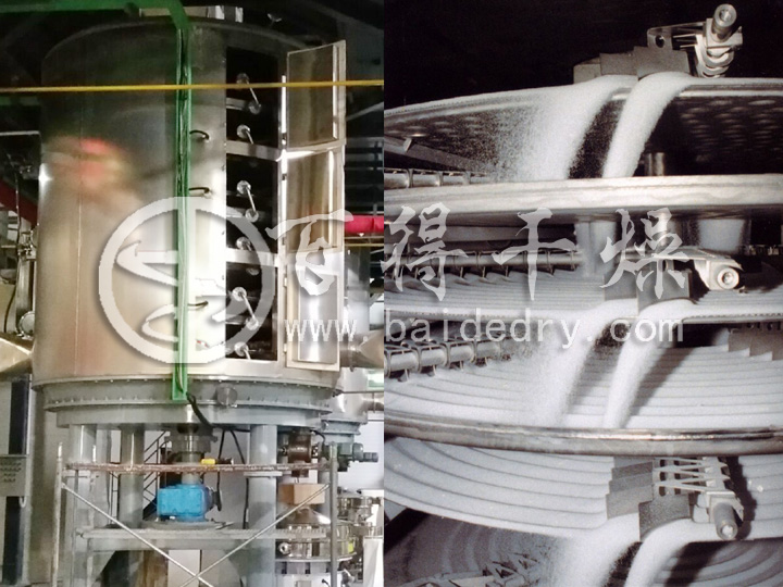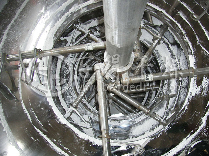 干燥过程:将载热体通入固定的多层空心圆盘内,借助传导间接加热金属盘面上接触的湿物料,并在类似铧犁形耙叶的机械搅拌作用下,不断向前翻滚移动的物料内的水份处于操作状态时的沸点下进行蒸发汽化,湿气从排湿口离开设备,从而在底部得到合格的干燥成品。