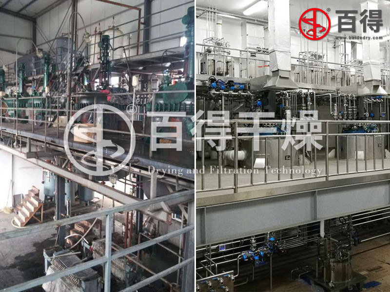 常州百得干燥对精细化工结晶、过滤、洗涤、干燥工艺进行整合,在继承传统精髓基础上,有所突破。从设备改革上入手,对其工艺进行整合,形成新的精细化工精制提纯整体工艺设备方案;从简化工序上入手,把过滤、洗涤、干燥三工序合在一机上完成,减少了工艺转序的次数;从全流程自动化控制、密闭操作上入手,对其进行改进,使整体工艺更适宜于精细化工工业化大生产的技术要求,配置多台过滤洗涤干燥机交替间歇使用,可实现连续化工作。