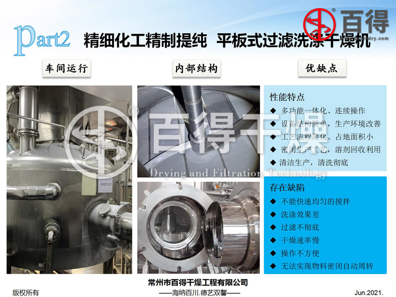 过滤洗涤干燥机为全密闭结构,间歇操作方式,采用真空过滤及加热干燥脱除溶剂,特别适用于处理易燃易爆、有毒或剧毒的危险产品,贵重产品,以及不允许有污染的鲜美食品、生物制品和药品等。