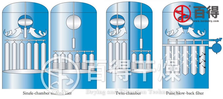 (2) 清灰方式为脉冲布袋清灰,工作时连续的离线清灰除尘。清灰效果远优于在线脉冲清灰和汽缸抖袋清灰方式,避免了干燥时物料死床。