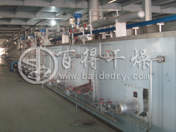 新型连续带式干燥机设置预干干燥燥段、恒速干燥段、降速干燥加冷却段三个干燥装置,一、预干恒速干燥段:湿颗粒因含水率较高,比重大,多数单元采用高风压大风量上循环方式,把料层中的表面水迅速带出,防止热风不能穿透物料层而影响干燥效果;二、降速干燥加冷却段:在干燥中后段,物料水分降到15%以下,比重变小,料层透气性好,采用中等风量下循环方式,将物料压住网带上,防止颗粒产生振动而破损和大量起粉尘。