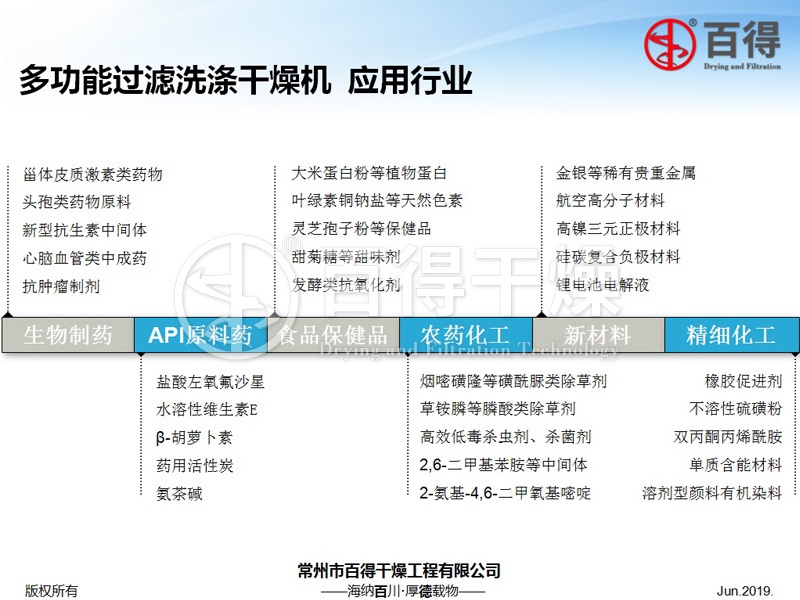 近几年来,常州百得干燥研发的多功能平板式过滤洗涤二合一,凭其可以在同一个容器内完成过滤、洗涤、自动出料以及可清洗和灭菌的优越性能,得到了迅速的推广和应用,逐步替代了传统结晶提纯类生产设备中诸如离心机、抽滤罐等设备,成为原料药过滤洗涤生产的新型设备。