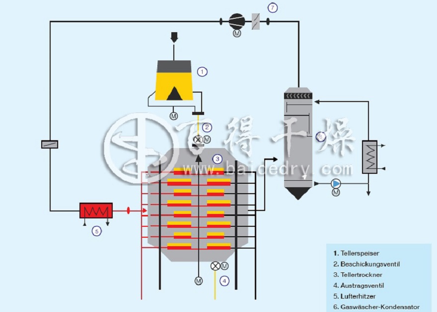 干燥过程:将载热体通入固定的多层空心圆盘内,借助传导间接加热金属盘面上接触的湿物料,并在类似铧犁形耙叶的机械搅拌作用下,不断向前翻抄移动的物料内的水份处于操作状态时的沸点下进行蒸发汽化,湿气从排湿口离开设备,从而在底部得到合格的干燥成品。