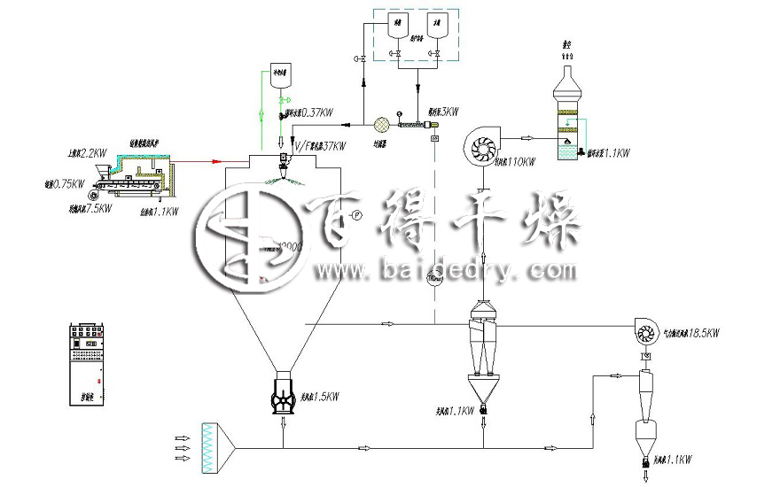 离心喷雾干燥机为热风循环、并流式、离心式雾化干燥机。干燥介质空气通过初、中效空气过滤器过滤,由加热器加热后,进入干燥器顶部空气分配器,热空气呈螺旋状均匀地进入干燥室。液体物料经过料液泵,输送到塔体顶部的高速离心雾化器,在离心力作用下喷雾成极细微的雾状液滴,与热空气并流接触,在极短的时间内可干燥为成品。成品连续被干燥塔底部和旋风分离器收集,尾气除尘后由引风机排空。