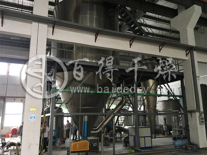 一个圆柱形高大的筒体,底部为锥形体,用于喷雾干燥。该塔体有热风的进出口、检查清洗口、观察孔、照明孔等。锥形部分还装有敲打装置。整个塔体安装在一个钢架支架上。