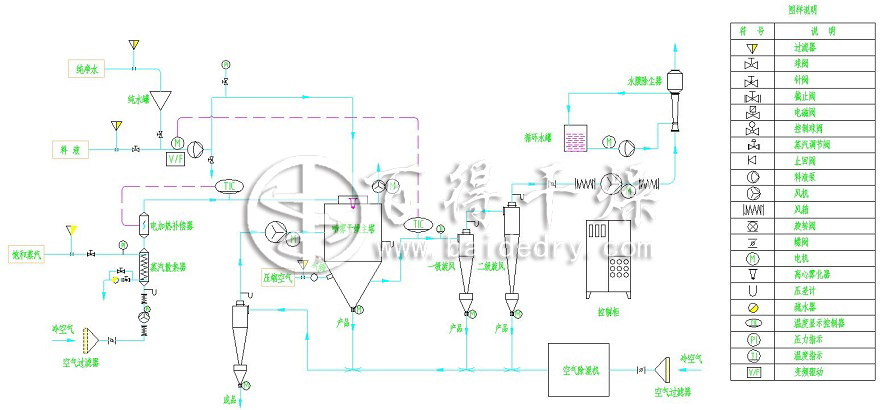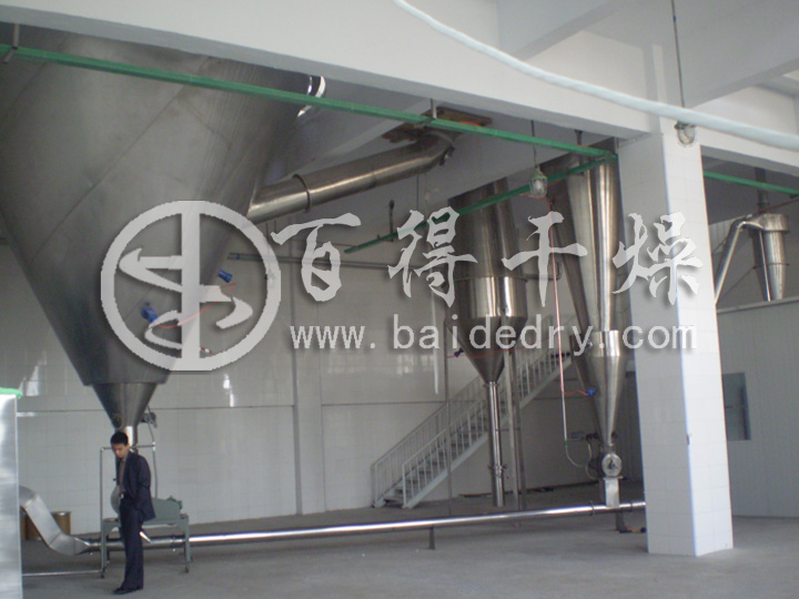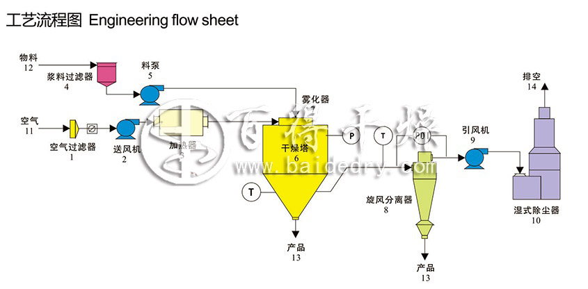 干燥机组由进风过滤系统、间接式燃气热风炉、热风分配器、干燥主塔、进料及雾化系统、高效旋风分离器、产品冷却回收系统、尾气除尘器系统等组成。