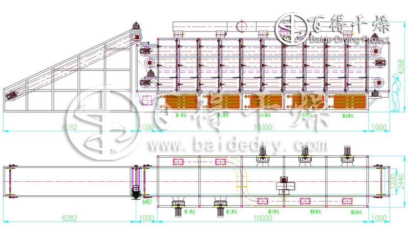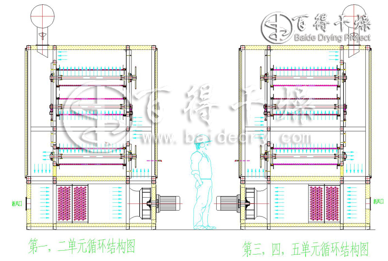 设备每个循环单元均有隔舱板隔开独立循环,隔舱板采用SUS304/δ1.2~1.5制作,使得带机在工作状态中每个单元间无窜风现象,提高干燥效率。设备每个循环单元均设有湿度仪及电动风门执行器实现自动排湿,节约能源。网带的两侧采用迷宫密封的方式,隔断侧风通路,也就可阻止物料从侧面跑料。所有新风补充口均装有中效过滤器,保证进风洁净度。采用独特的内部送风、均风装置,不但提高了物料与热空气之间的相对速度,提高干燥速率,并能使得物料干燥均匀一致。
