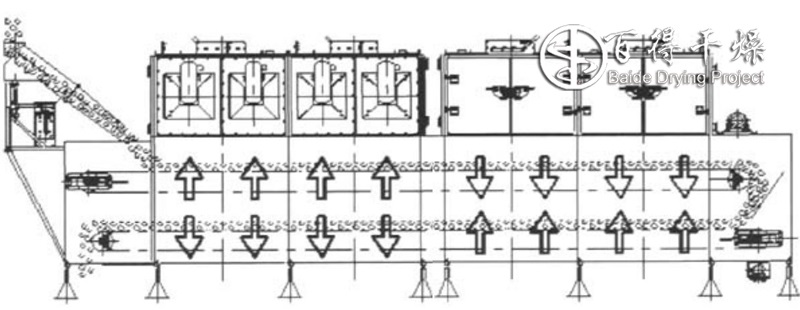 具体原理:空气在经过干燥机内部的热交换器加热后,在循环风机的推动下进入干燥机。在输送带上干燥介质与物料进行热量与水份的交换后,一部分空气通过公共风管排出,另一部分空气经过热交换器的二次加热,同时混合新鲜空气再次进入干燥机。