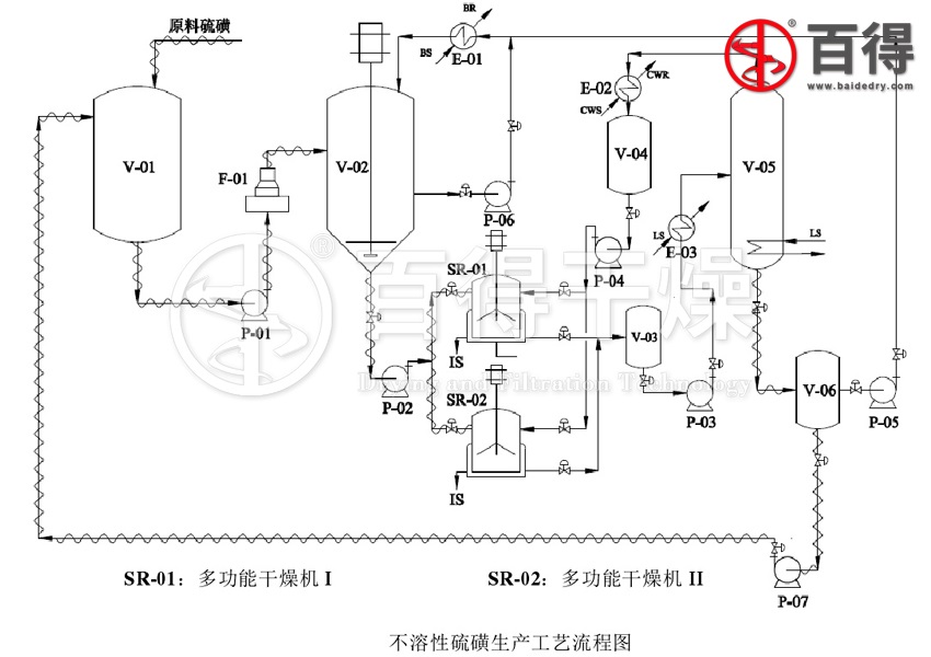 生产过程主要包括原料预处理过程、急冷过程、产物的后处理过程和废液回收过程等四大部分。其中的关键工艺为可溶性硫磺和不溶性硫磺的萃取分离:用泵P-02将急冷的产物打入到三合一干燥机中,进行后续处理。由于三合一干燥机是一种集过滤、干燥、萃取为一体的多功能干燥设备。因此,在三合一干燥机内可以完成对急冷产物的分离,然后固化干燥、萃取提纯等工序,得到品质较高的IS产品。由于后续处理过程需要消耗一定的时间,所以需要将物料切换到下一个三合一干燥机中。具体过程如下: