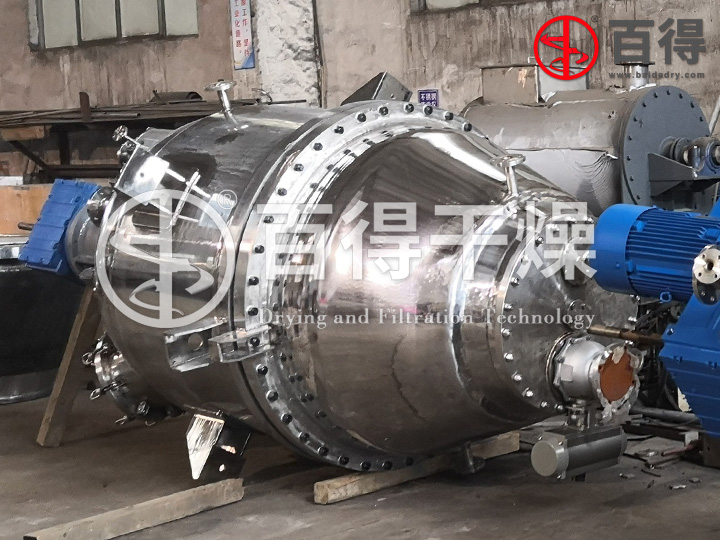 常州百得依据传统激素类医药中间体采用有机溶剂提取工艺而设计出的新型全密闭结晶过滤洗涤干燥一体机,能极大地改善工作环境,提高溶剂的回收率。医药级过滤洗涤干燥多功能设备简化了工艺流程,解决了传统工艺中甩干、洗涤、烘干多道工序在不同设备完成而造成多次周转的污染问题。该装置不仅实用于溶剂型结晶物干燥,而且对于细小微粒的原料药结晶物生产也实用,具有极强实用价值,值得推广应用。